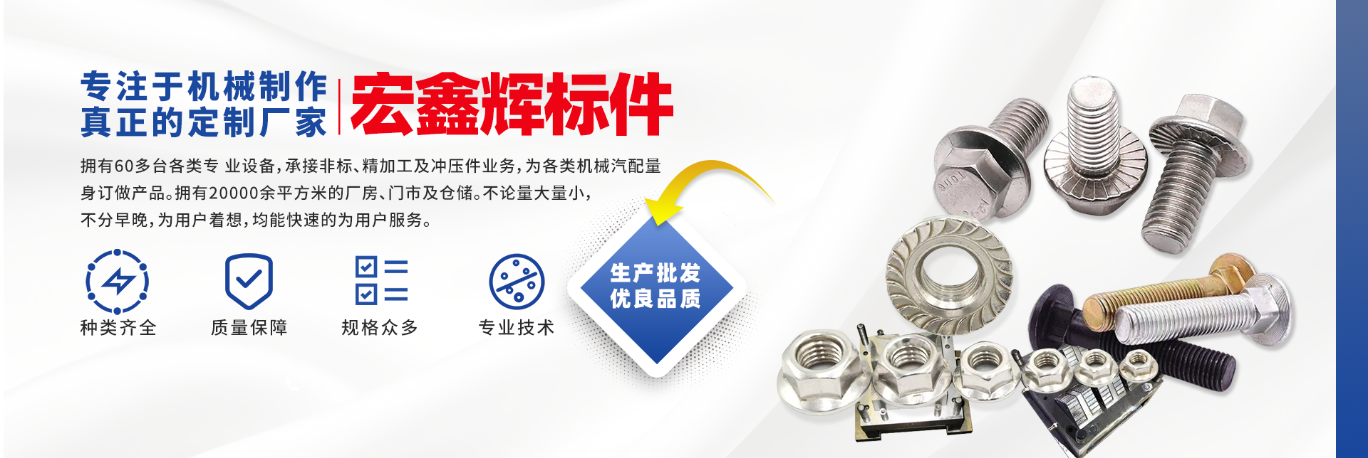 四川宏鑫輝標準件制造有限公司下設:南充市宏輝機械制造有限公司,南充市聚宏機電設備有限公司,公司始建于1994年。為了拓展市場,降低成本,本公司于2007年、2020年分別在南充、 成都、重慶創(chuàng)建了生產基地。擁有60多臺各類專 業(yè)設備,承接非標、精加工及沖壓件業(yè)務,為各 類機械汽配量身訂做產品。擁有20000余平方米的廠房、門市及倉儲。公司以誠信為本,竭誠為廣大客戶提供服務。不論量大量小,不分早晚,為用戶著想,均能快速的為用戶服務。 公司所生產及代理的產品為業(yè)界人士公認的國內、國際優(yōu)等品牌。在產品性能與質量